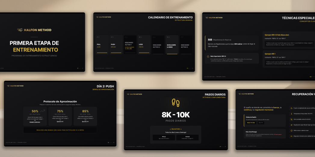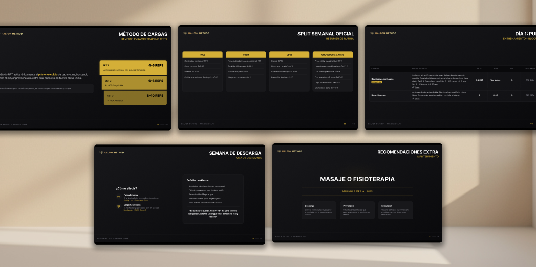 Halfon Method es un programa de entrenamiento online basado en estructura, progresión y metodología clara. El objetivo no era solo “hacer unas slides bonitas”, sino construir una narrativa visual sólida que respaldara la seriedad y el valor del programa. Trabajamos el dossier comercial y todo el sistema de presentación del programa, definiendo una línea gráfica coherente, estratégica y orientada a conversión. La estética se construyó sobre una base oscura, limpia y técnica, reforzada por acentos en amarillo que aportan energía, jerarquía y puntos de activación visual. El diseño transmite precisión, método y rendimiento. Cada slide está pensada para guiar al usuario a través del proceso: etapas del entrenamiento, beneficios, estructura, métricas y resultados. No se trata solo de informar, sino de generar confianza y percepción de alto valor. Desarrollamos: • Dossier comercial para presentación del programa. • Sistema completo de slides estructuradas. • Jerarquías tipográficas claras y consistentes. • Recursos visuales para reforzar metodología y progresión. • Adaptación del lenguaje visual al entorno digital. El resultado es una presentación coherente, profesional y alineada con un programa que se posiciona como método, no como rutina suelta.